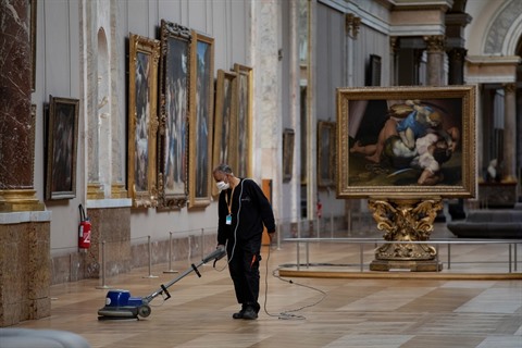 | Préparation le 23 juin 2020 dans les galeries du Musée du Louvre à sa prochaine réouverture. |