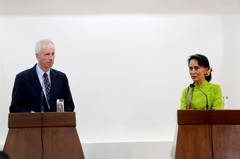 | Stéphane Dion et Aung San Suu Kyi, le 7 avril à Nay Pyi Tawn, au Myanmar. |