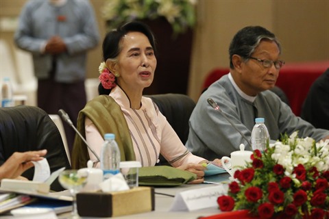 | La conseillère d'État birmane, Aung San Suu Kyi, lors d'une réunion dans l’État Shan du Myanmar, le 24 avril. |