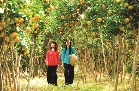 | Deux touristes, portant l’ao bà ba, la tenue traditionnelle des femmes du Sud, se baladent dans un verger. Photo : CTV/CVN |