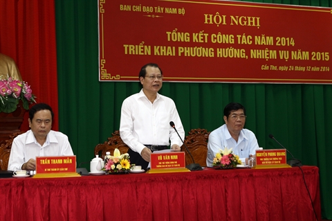 | Le vice-Premier ministre Vu Van Ninh (centre) lors de la conférence-bilan du Comité de pilotage du Nam Bô occidental, le 24 décembre à Cân Tho (delta du Mékong) |