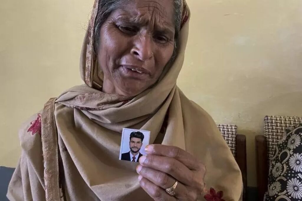 | La mère d'un migrant pleure son fils, disparu dans un naufrage en mer Ionienne, à Bandli, au Pakistan, le 20 juin. |