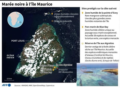 | Carte de l'île Maurice localisant les sites protégés de la côte sud-est touchés par une marée noire. |