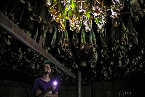 | Un ouvrier agricole contemple des feuilles de tabac en train de sécher à Esteli, au Nicaragua. |