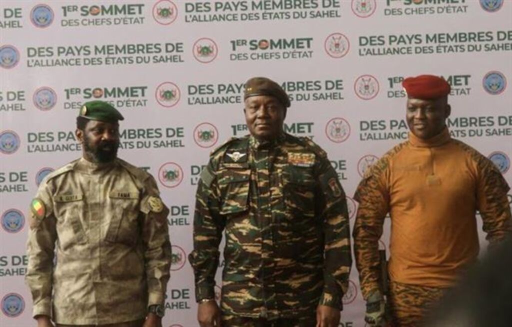 | De gauche à droite : le chef du gouvernement du Mali, Assimi Ganita ; le général du Niger, Abdoourahamane Tiani ; et le commandant du Burkina Faso, Ibrahim Traore, à Niamey (Niger). |