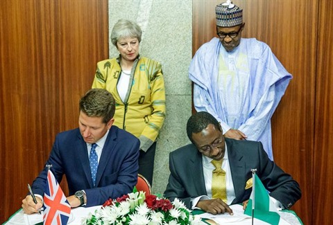 | Le président nigérian Muhammadu Buhari et la Première ministre britannique Theresa May, lors de la signature des accords, le 29 août. |
