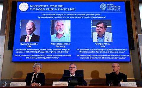 | Les lauréats du Nobel de physique 2021 sont Syukuro Manabe (américano-japonais), Klaus Hasselmann (allemand) et Giorgio Parisi (italien). |