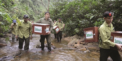 | Nguyên Van Thai (2e plan) lors d’une sortie sur le terrain pour relâcher des pangolins dans la nature. |