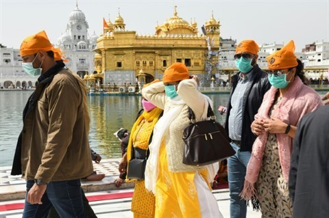 | Des fidèles viennent prier au Temple d'Or d'Amritsar, édifice sacré des Sikhs. |