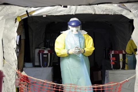| Un médecin dans une unité de traitement pour personnes souffrant d'Ebola à Monrovia, le 19 décembre 2014. |