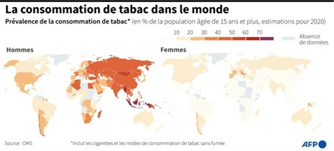 En 2020, 1,3 milliard de personnes consommaient du tabac dans le monde, soit 20 millions de moins que deux ans plus tôt, selon un nouveau rapport de l'Organisation mondiale de la santé. Elle table sur une poursuite du recul jusqu'en 2025 et prévoit alors 1,27 milliard de consommateurs ou environ 20% de la population mondiale âgée de plus de 15 ans. En 2000, cette proportion était encore de près d'un tiers.