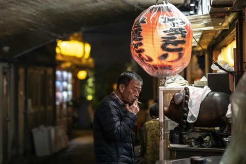 | Un homme fume devant un restaurant de Tokyo, le 3 novembre. |