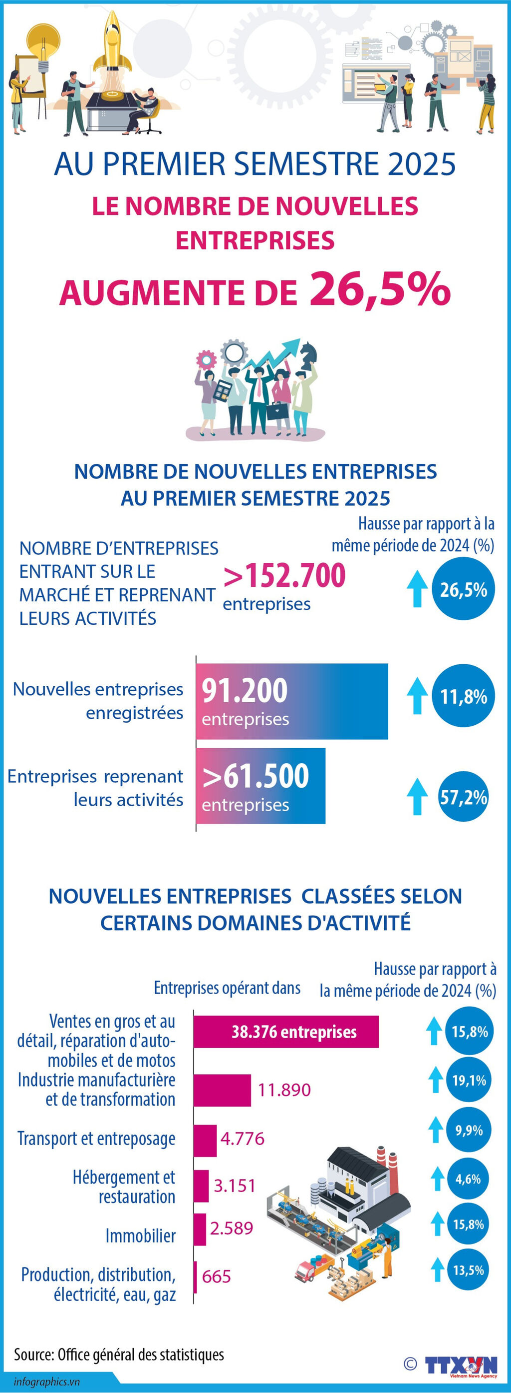 Selon les données de l’Office général des statistiques, au premier semestre 2025, 91.200 nouvelles entreprises ont été créés et 61.500 entreprises ont repris leurs activités, soit une hausse de 11,8% et 57,2% respectivement par rapport à la même période de 2024.