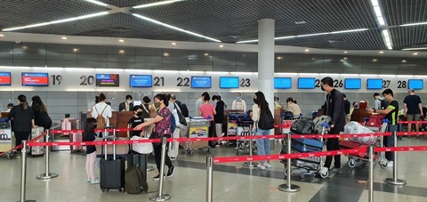 | Des passagers à l'aéroport international de Phnom Penh, au Cambodge. |