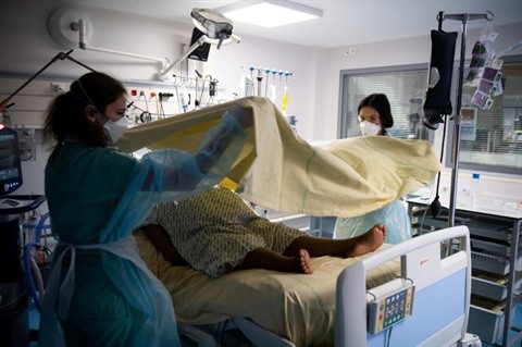 | Des membres du personnel médical s'occupent d'un patient en soins intensifs pour malades du Covid, le 4 mai 2021 à Colombes, près de Paris. |