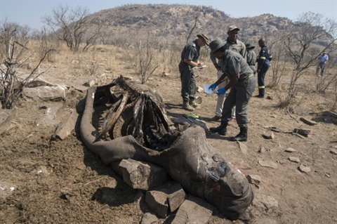 | Prélèvements d'ADN sur une carcasse de rhinocéros tué pour sa corne, dans le parc Kruger, en Afrique du Sud. |