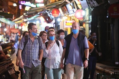 | Des touristes étrangers dans le Vieux quartier de Hanoï, le 13 mars. |