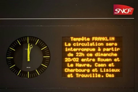 | Message d'information de la SNCF en gare du Havre alors que le Nord de la France fait face à la tempête Franklin, le 20 février. |