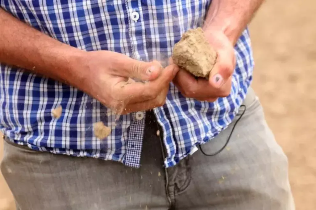 | Un maraîcher émiette un morceau de terre sèche prélevé dans un champ qu'il devra irriguer pour cultiver ses légumes, à Carnin (Nord), le 20 mai. |