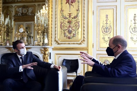 | Le président Emmanuel Macron (gauche) reçoit le nouveau chancelier allemand Olaf Scholz à l'Élysée, le 10 décembre à Paris. |