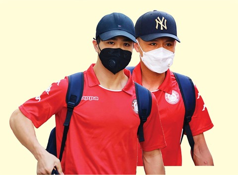 | Les footballeurs Công Phuong (gauche) et Huy Toàn portent des masques pour se protéger du nouveau coronavirus. |