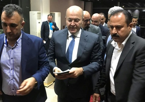 | Le nouveau président d'Irak, Barham Saleh (centre), élu par le Parlement à Bagdad, le 2 octobre. |