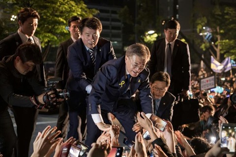 | Moon Jae-in salue ses partisans après l'annonce de sa victoire, le 9 mai |