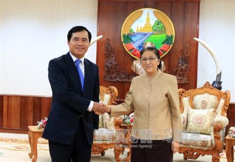 | La présidente de l'AN lao Pany Yathotou reçoit, le 30 mai à Vientiane, le vice-ministre vietnamien de la Construction, Lê Quang Hung. |