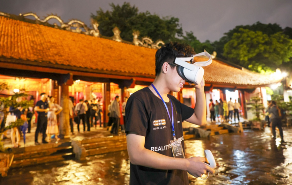| Un touriste découvre la technologie de réalité virtuelle lorsqu'il visite le Temple de la Littérature à Hanoï. |
