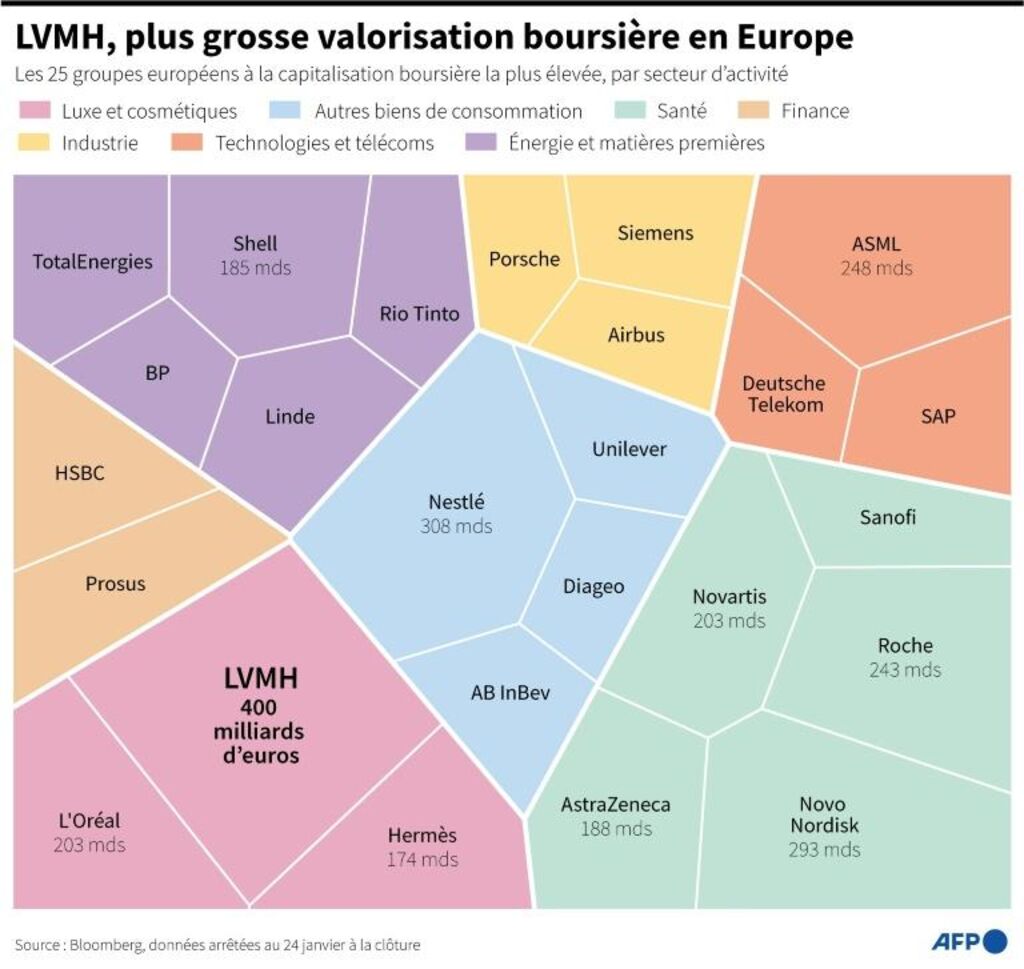 LVMH qui a dépassé en janvier le seuil des 400 milliards d'euros de capitalisation boursière, une première pour une entreprise européenne, versera un dividende de 12 euros par action à ses actionnaires. Il était de 10 euros sur l'exercice précédent.