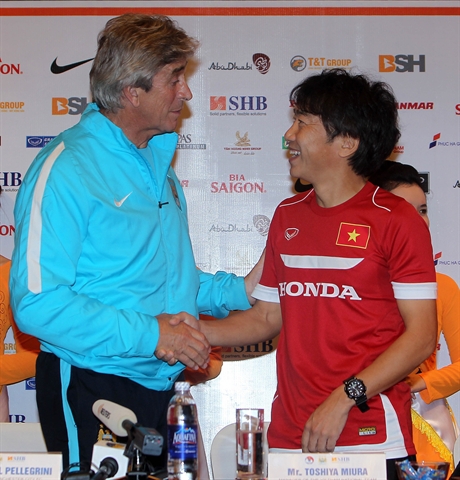 | Le sélectionneur du Onze vietnamien, Toshiya Miura, et l'entraîneur de Manchester City, Manuel Pellegrini, lors d'une conférence de presse le 26 juillet à Hanoi. |