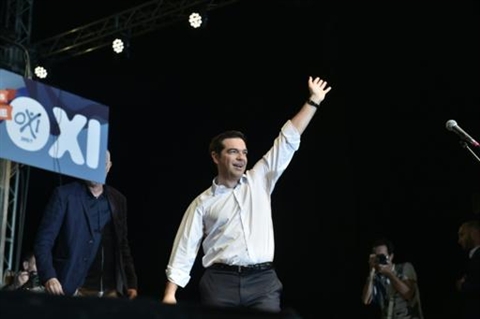 | Le Premier ministre grec Alexis Tsipras salue la foule de ses partisans, le 3 juillet 2015 à Athènes, venus manifester pour le non au référendum. |