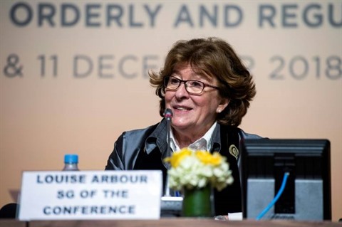 | Louise Arbour, la représentante spéciale de l'ONU pour les migrations, lors d'une conférence de presse le 9 décembre à Marrakech, au Maroc. |