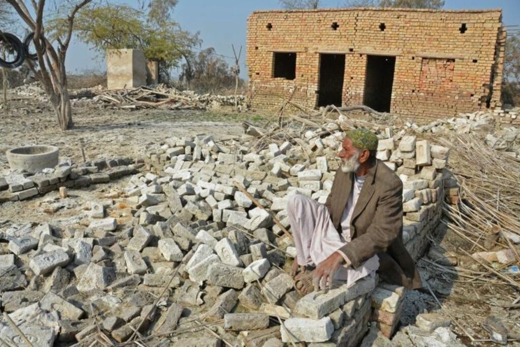| Un homme à proximité de sa maison endommagée par les inondations, à Dera Allah Yar, au Pakistan, le 9 janvier. |