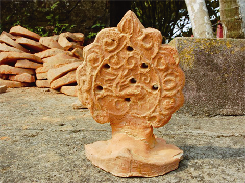 | Une des tuiles d’ornement en forme de fleur de lotus exhumées récemment lors des fouilles. |
