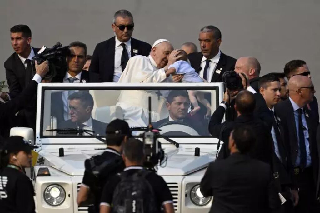 | Le pape François bénit un bébé avant de présider la prière du Rosaire à la chapelle des apparitions du sanctuaire de Notre-Dame de Fatima, au Portugal, le 5 août 2023. |