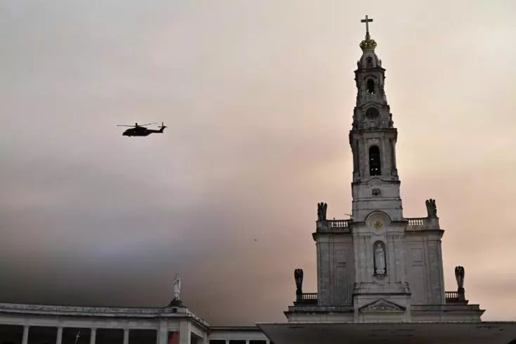 Transporté à bord d'un hélicoptère de l'armée de l'air portugaise, le souverain pontife de 86 ans a d'abord survolé la vaste esplanade du sanctuaire dans un ciel rougi et obscurci par la fumée et la cendre provoquées par un feu de forêt à une centaine de kilomètres de là.