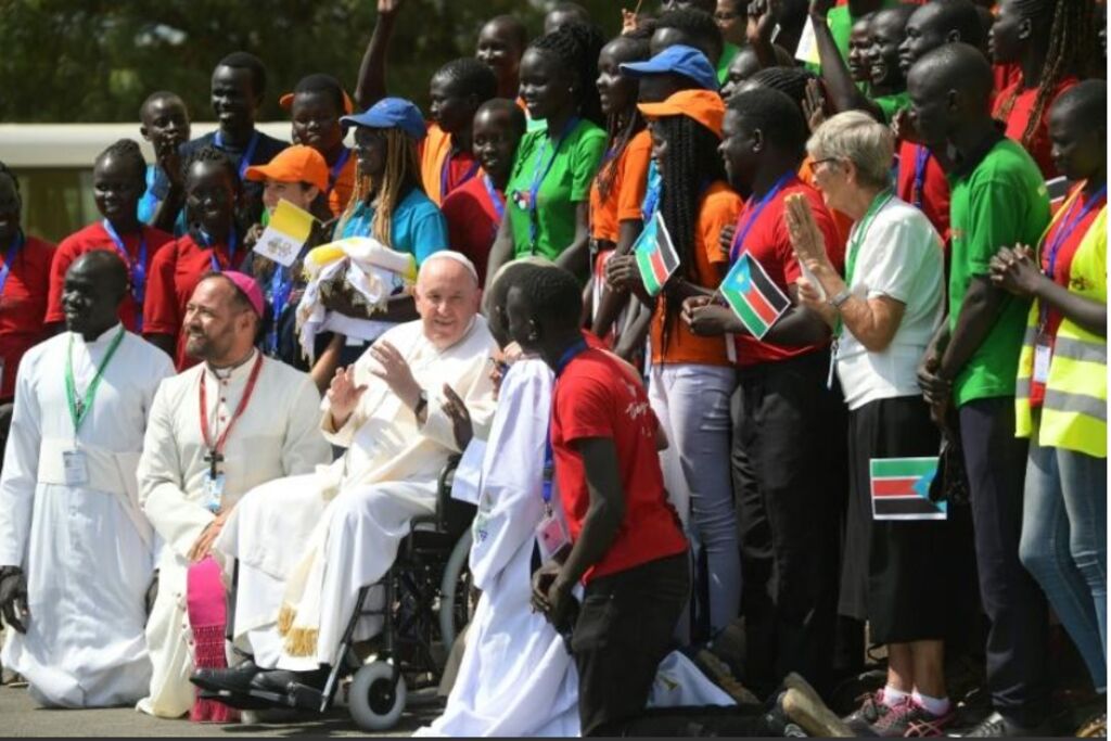 | Le Pape François échange avec des jeunes après une réunion à la cathédrale de Sainte-Thérèse à Juba, au Soudan du Sud, le 4 février 2023. |
