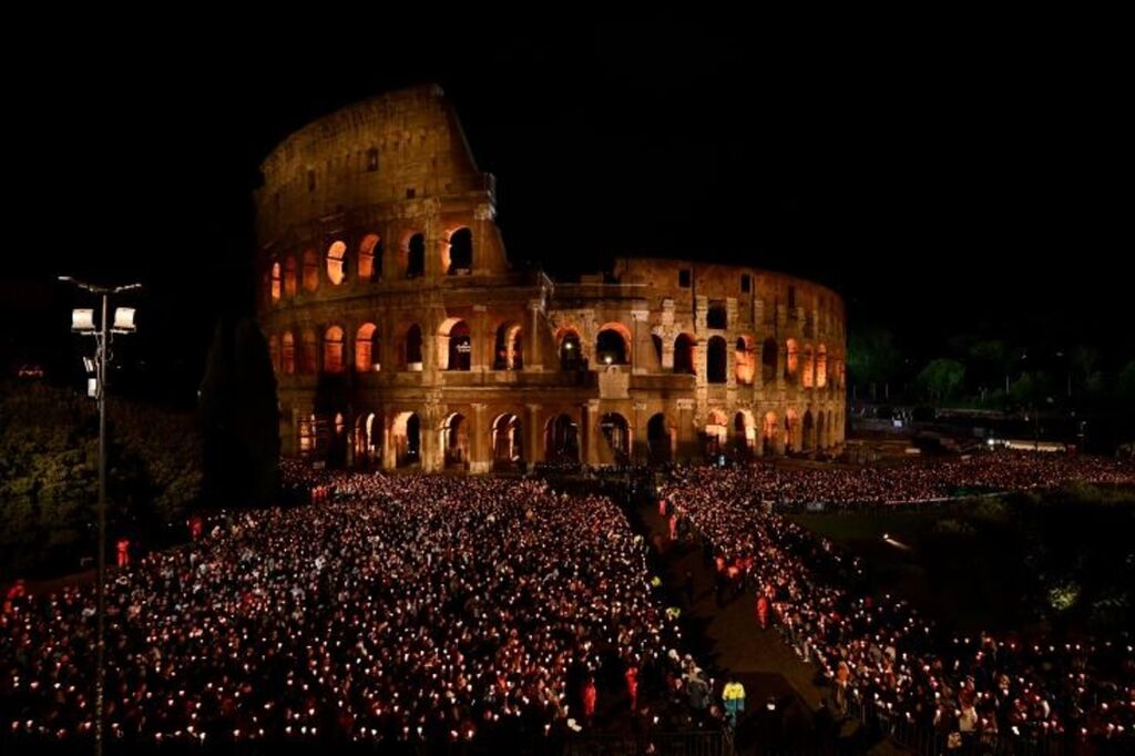| Des fidèles tiennent des bougies à l'extérieur du Colisée pendant le Chemin de Croix (Via Crucis) dans le cadre du Vendredi Saint pendant la Semaine Sainte à Rome le 18 avril. |