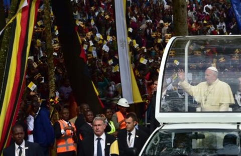 | Le pape François dans sa papamobile à Kampala, le 28 novembre. |