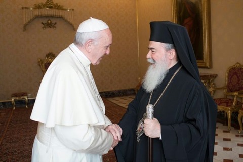 | Une photographie fournie par le service de presse du Vatican, montrant le pape François saluant le patriarche grec orthodoxe Theophilos III de Jérusalem, au Vatican, le 23 octobre. |