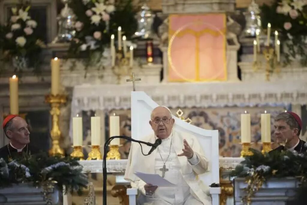 | Le pape François, entouré du cardinal François-Xavier Bustillo, à gauche, et de l'évêque Eric de Moulins-Beaufort, délivre son message à l'intérieur de la cathédrale Notre-Dame de l'Assomption d'Ajaccio à l'occasion de sa visite d'une journée en Corse. |