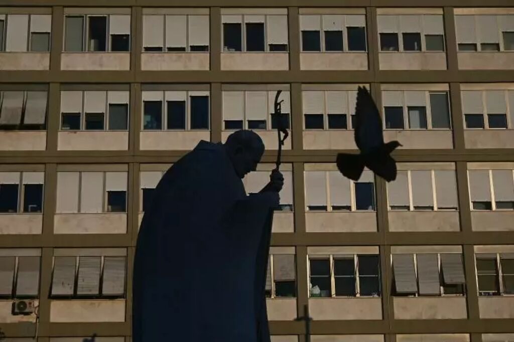 | Un pigeon vole devant la statue du pape Jean-Paul II à l'extérieur de l'hôpital Gemelli où le pape François est hospitalisé pour une pneumonie, à Rome le 19 mars. |