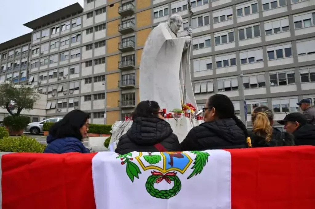 | Un drapeau péruvien posé sur un banc où prient des personnes devant la statue de Jean-Paul II, à l'extérieur de l'hôpital Gemelli à Rome, où le pape François est soigné pour une pneumonie. |