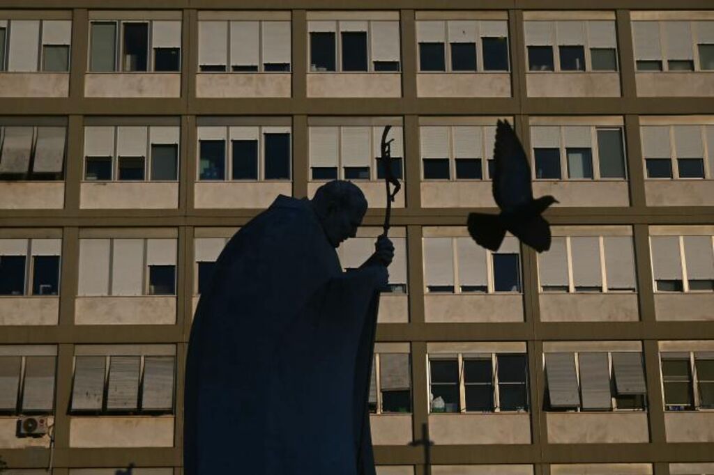| Un pigeon vole devant la statue du pape Jean-Paul II à l'extérieur de l'hôpital Gemelli où le pape François est hospitalisé pour une pneumonie, à Rome le 19 mars. |