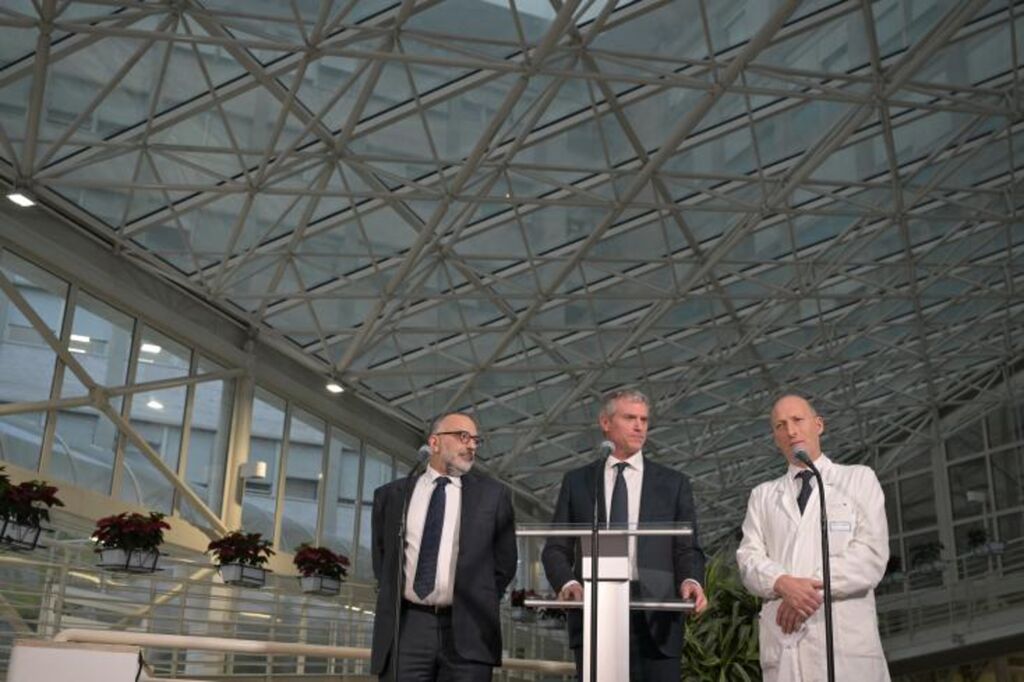 | Le directeur de la Salle de presse du Saint-Siège, Matteo Bruni (centre), le professeur Sergio Alfieri (droite) et le docteur Luigi Carbone donnent une conférence de presse à l'hôpital Gemelli où le pape François est hospitalisé à Rome, le 22 mars. |