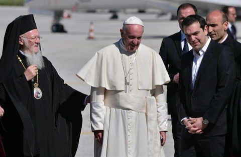 | Le Premier ministre grec Alexis Tsipras (droite) et le patriarche oecuménique Mgr Bartholomée (gauche), entourent le pape François lors de sa visite sur l'île de Lesbos, le 16 avril. |
