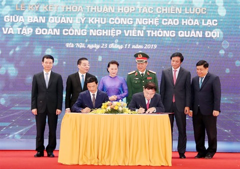 La présidente de l’Assemblée nationale a assisté à la signature d’un accord stratégique entre le comité de gestion du parc et le groupe Viettel, ainsi qu’à la publication des décisions relatives aux plans d’investissement de quatre projets, y compris les sociétés VinSmart Research and Manufacture JSC, Mediplantex JSC, A&A Green Phoenix Group JSC et Hulk Energy JSC.