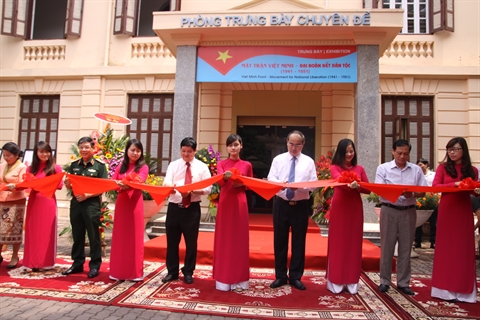| Nguyên Thiên Nhân, membre du politburo, président du Front de la Patrie (4e, droite) a coupé les bandes pour inaugurer l’exposition sur le Front Viêt Minh en mai 2016 à Hanoï. |