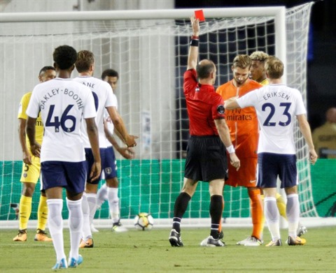 | Kevin Trapp, le gardien de but du Paris Saint-Germain, reçoit un carton rouge de l'arbitre Ted Unkel lors du match contre Tottenham, le 22 juillet à Orlando, Floride. |